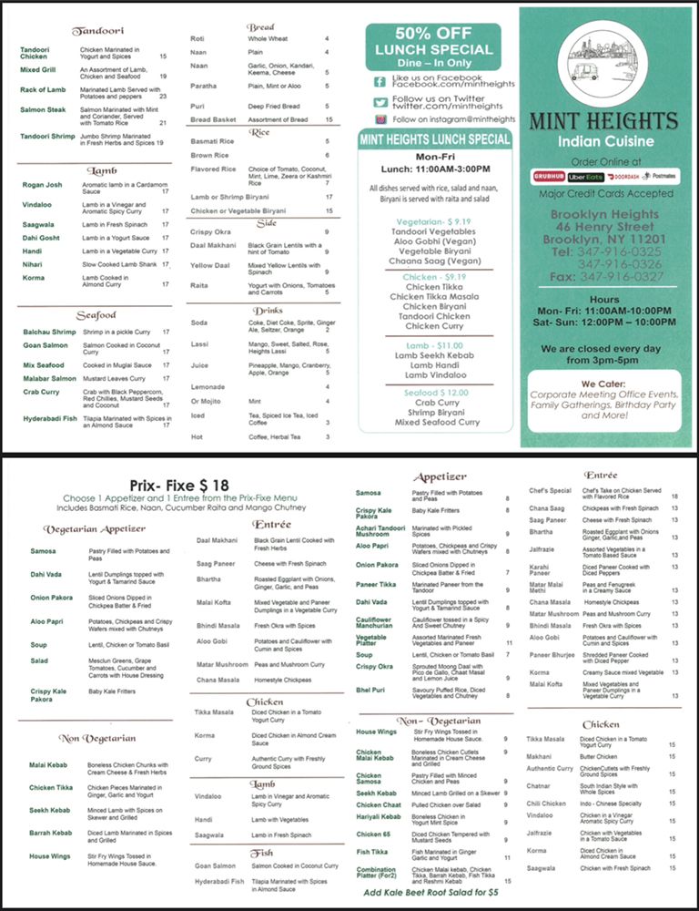 Mint Heights is a popular Indian restaurant located at 46 Henry St Brooklyn, NY 11201, that offers a wide range of amenities including reservations, delivery, takeout, vegan options, and more. Customers rave about the delicious food and fast service, with standout dishes like chicken makhani, tikka, saag paneer, and eggplant bharatha receiving high praise. The restaurant's cozy atmosphere and friendly staff add to the overall dining experience. Some patrons noted slight issues with tenderness in certain dishes but overall enjoyed their meals. With a diverse menu, excellent service, and tasty offerings, Mint Heights is a must-visit for Indian cuisine enthusiasts in the area.